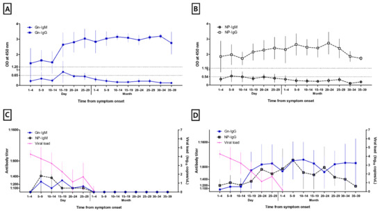 Kinetics of severe fever with thrombocytopenia syndrome (SFTS)-specific antibodies measured by enzyme-linked immunosorbent assay: (A) anti-Gn glycoprotein-specific antibody IgM and IgG; (B) anti-nucleocapsid protein (NP)-specific antibody IgM and IgG; (C) anti-Gn glycoprotein-specific antibody IgM, anti-NP-specific IgM, and SFTSV load; and (D) anti-Gn glycoprotein-specific antibody IgG, anti-NP-specific IgG, and SFTSV load.