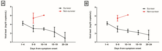 Kinetics of viremia in patients with severe fever with thrombocytopenia syndrome (SFTS): (A) M segment and (B) S segment.
