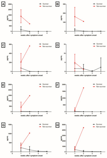 IFN-α (non-survivor, 1387.2 pg/mL vs. survivor, 154.8 pg/mL, p = 0.03) and IFN-γ (162.7 pg/mL vs. 15.1 pg/mL, p = 0.03) levels in the deceased patients within one week (days 1–7) after symptom onset were significantly higher than those in survivors (Figure 3). In survivors, the levels of IFN-α, IFN-γ, IL-10, IL-6, IL-8, IP-10, and MCP-1 were mildly elevated during the early phase of the SFTS clinical course, and then decreased throughout the remainder of the course of the disease. IL-17A levels did not show significant changes during the clinical course of the disease. In deceased patients, IL-10, IL-6, IL-8, IP-10, and MCP-1 levels were markedly increased at 2 weeks (days 8–14) after symptom onset, whereas IFN-α and IFN-γ levels decreased at 2 weeks.