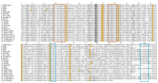 Amino acid alignment of the sequences of the Erns analyzed in this study. Sequences carrying the asterisk were not published elsewhere. The corresponding references and, where available, the GenBank numbers are reported in Table 1. To prevent the cleavage of the Strep-tag, the last four amino acids at the C-terminus of APPV-, Bat-, Rat77-, Rat99- and Pangolin-Erns, were modified in “GFYA”. In yellow are highlighted the cysteine (C) residues important for intra- and inter-molecular disulfide bridges. The orange boxes are focusing on the two RNase active sites conserved among most pestiviruses (except for APPV- and Bat-pestivirus), whereas the black box highlights the residue important for RNase activity as identified in this study using Erns of giraffe pestiviruses. The proposed “positive-region” and “heparin-binding-domain” [24] are boxed in blue.