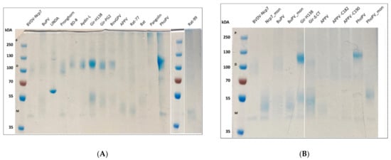 To obtain information about the quaternary structure of the different Erns proteins, we separated each purified protein by SDS-PAGE under non-reducing conditions and stained it with Coomassie Brilliant Blue (Figure 2A,B). The results are consistent with the predictions based on the primary structure of the proteins, i.e., in the absence of the cysteine at position 171 or a cysteine in analogous position (Figure 1; numbering according to Erns of strain BVDV-Ncp7 [44]), only the monomeric form is detected, whereas in the presence of this residue, monomeric, dimeric, and polymeric forms could be identified. Specifically, APPV, Bat- and both Rat-Erns proteins were only present in form of monomers and polymers, but not dimers, and the staining intensity in the gel appeared to be lower than most of the other proteins. Additionally, the presence of two additional cysteines in the N-terminus of BD8-Erns did not appear to play a role, neither in dimerization of the protein nor for its RNase activity compared to similar proteins without these additional cysteines (e.g., Aydin-like-Erns). Consistently, artificial mutants of BVDV-Ncp7-, BuPV- and PhoPV-Erns, where the ninth cysteine was substituted by an arginine, could not form dimers (Figure 2B). On the other hand, the insertion of a cysteine residue in either position 182 or 190 in the APPV-Erns did not induce a change of pattern appreciable by Coomassie staining (Figure 2B).