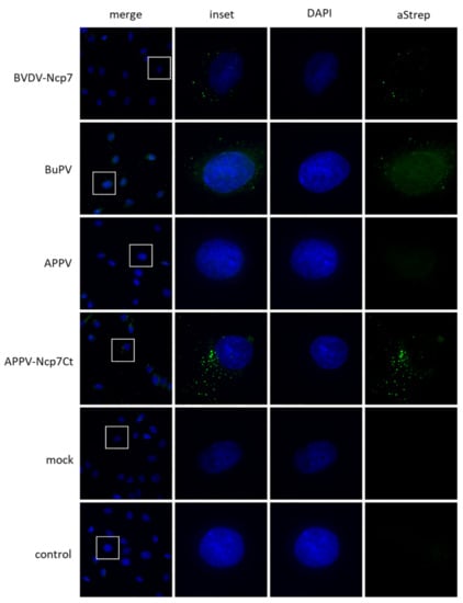 Representative examples of the immunofluorescence (IF) labeling of Erns proteins. Erns was detected by IF microscopy as described using a primary antibody against the Strep-tag present at the C-terminus of each construct and a secondary antibody conjugated with Alexa 488 (green). Cells not treated with Erns are labelled as “mock”, whereas cells incubated with BVDV-Ncp7-Erns but treated only with the secondary antibody are labelled with “control”. Nuclei were stained with DAPI (blue) present in the mounting medium. The same image processing settings were used for mock and all constructs. For each microphoto, obtained with a 40× air objective, an area was selected (white square), magnified five times, and displayed to its right-hand side. One representative experiment out of three is shown. As most of the Erns proteins could not be detected by IF labeling, only BVDV-Ncp7-Erns and BuPV-Erns that gave a clear signal are shown, in addition to one example (APPV-Erns) that could not be visualized. By contrast, substituting the C-terminus of APPV-Erns with the one of BVDV-Ncp7-Erns allowed for efficient detection of the chimeric protein.