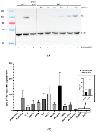 Inhibition of interferon expression was analyzed using the expression of Mx proteins as a proxy. (A): Example of a Western blot used to quantify the expression of Mx and the housekeeping protein β-actin in cells incubated with Bat-Erns and subsequently stimulated with poly(IC). The size (kDa) of the pre-stained protein ladder is indicated on the left. The uncropped gel is available in Supplementary Material Figure S3. (B): The amount of each Erns protein required to reduce the Mx signal by 50% is reported for the proteins that yielded a signal reduction sufficiently strong to be analyzed (n = 3 ± SD). As BoGPV- and BuPV-Erns were considerably stronger than the other proteins, their results are reported in the inset with a different scale on the y-axis and displaying the amount of these Erns proteins to reduce the Mx signal by 95%. Proteins that did not display any detectable activity (i.e., Erns of Gir-PG2, Gir-H138 and pronghorn antelope) are not shown. The activities of the various Erns proteins in relation to the one of BVDV-Ncp7 is shown in Table 1.