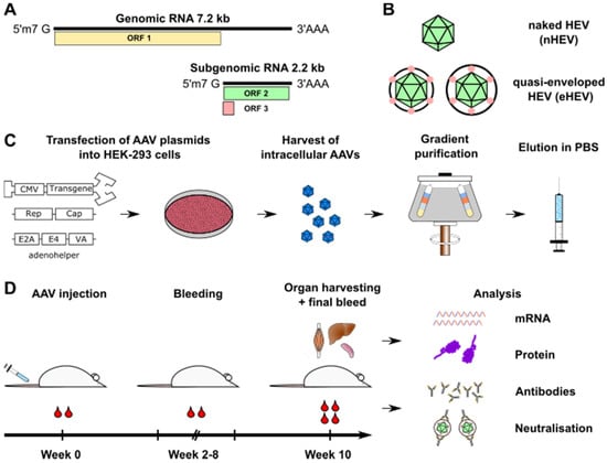 Experimental overview. (A) The full-length 7.2 kb HEV genome encodes the replicase ORF1, and a 2.2 kb subgenomic HEV RNA encodes capsid ORF2 and the small phosphoprotein ORF3 []. (B) HEV exists in two forms: a non-enveloped virion (nHEV) found in faeces/intracellularly and a quasi-enveloped virion (eHEV) found in the blood stream and cell culture supernatant. Whether ORF3 is (partially) presented on the outside of eHEV particles remains unclear. (C) Production of AAV vectors was accomplished by triple-transfection of HEK-293 cells with a recombinant AAV vector plasmid encoding ORF3 or YFP (yellow fluorescent protein), an AAV helper plasmid encoding rep of AAV2 together with the synthetic capsid gene MYO3, as well as an adenoviral helper plasmid. This was followed by a harvest of the AAVs from the cell pellet and their purification by iodixanol density gradient centrifugation, buffer exchange to PBS, titration of AAV genome copies, and particle concentration. (D) Initial blood (60–80 μL) was collected from the facial vein before intravenous injection of 1 × 1011 or 1 × 1012 AAV vector particles encoding ORF3 or the YFP control (always diluted in 100 μL PBS) into four mice each. Mice were bled every two weeks (60–80 μL) to monitor the antibody response. At week 10, mice were euthanised by a final bleed under intraperitoneal anaesthesia. Their quadriceps femoris muscle, liver, and spleen were harvested for further analysis, as indicated.