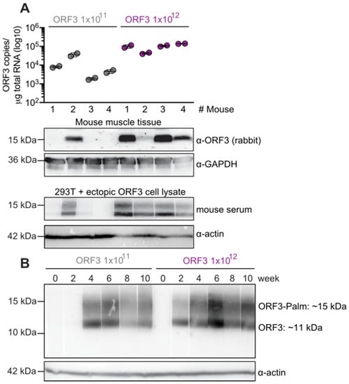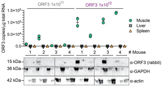 As shown in Figure 2, both RT-qPCR and Western blot (WB) analysis revealed ORF3 expression in the muscle, but not in the spleen or the liver of ORF3-transduced mice. In addition, we observed an AAV dose-dependent ORF3 expression. While only one of the four mice injected with 1 × 1011 ORF3 AAV vg showed modest ORF3 expression, all four mice injected with 1 × 1012 ORF3 AAV vg expressed ORF3, albeit at varying levels. Based on the RT-qPCR data, the threshold for detection of the ORF3 protein by Western blotting was ~3 × 104 ORF3 mRNA copies per μg of total RNA. Using a polyclonal anti-rabbit ORF3 antibody, we only detected the palmitoylated ORF3 (~15 kDa) form [] in the muscle. As loading controls for the WB, we detected different housekeeping genes, due to their differential expression in the different tissues tested. These results confirmed that the myotropic AAV capsid MYO3 used in our study specifically transduces the muscle of injected mice.