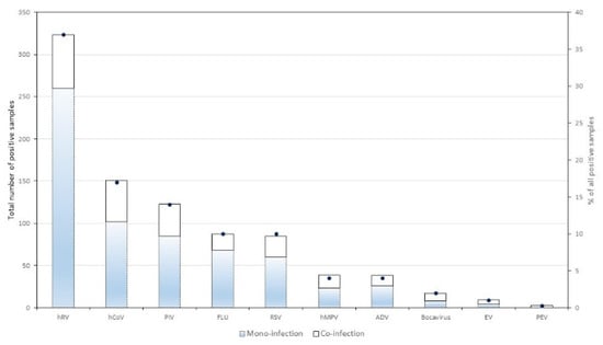 Positive samples of respiratory viruses. Bar charts represent the absolute number of positive samples for each screened respiratory virus and are divided according to mono- and co-infections. Dots represent the proportion of positive samples among all positive samples. HRV—human rhinovirus; HCoV—human coronavirus; PIV—parainfluenza virus; FLU—influenza; RSV—respiratory syncytial virus; hMPV—human metapneumovirus; ADV—adenovirus; EV—enterovirus; PEV—parechovirus.