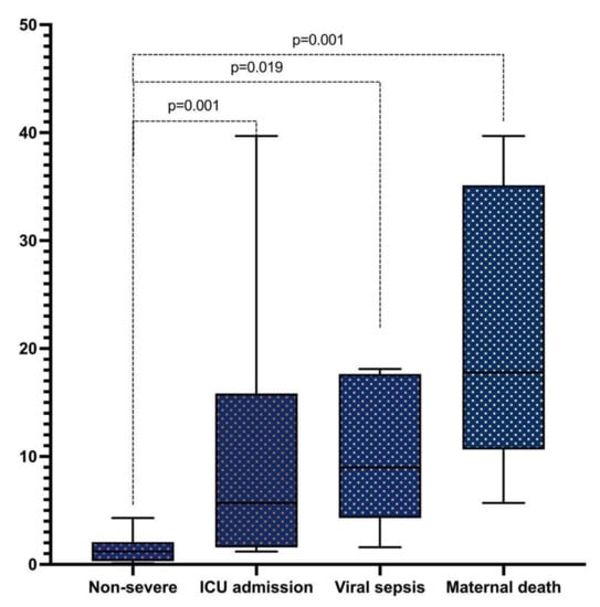 A total of 115 pregnant women with suspected SARS-CoV-2 infection were included in the original cohort. In total, 28 were excluded because although they were COVID positive, they did not warrant hospital admission or additional biochemical evaluation, as they were asymptomatic. Consequently, 87 symptomatic pregnant women with SARS-CoV-2 infection were included in the statistical analysis: of those, 31 (35.63%) had severe COVID-19 pneumonia, including 6 (6.89%) maternal deaths.