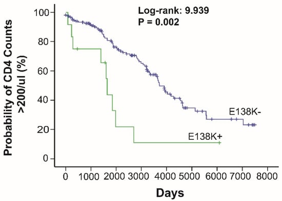 Kaplan–Meier survival analysis of RT E138K mutation on HIV disease progression to CD4+ T cells. Kaplan–Meier survival analysis was carried out to estimate the effect of HLA-specific adapted escape mutation-RT E138K on the time of CD4+ T cell counts to below 200 cells/µL (diagnosis of AIDS). Log-rank test was used to compare the time of CD4+ T cells declining to <200 cells/µL of two groups: the participants harboring RT E138K mutations and those who do not have the mutations. A p-value < 0.05 is considered significant. RT: reverse transcriptase.