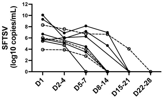 - Nakamura, S.; Iwanaga, N.; Hara, S.; Shimada, S.; Kashima, Y.; Hayasaka, D.; Abe, K.; Izumikawa, K.; Yanagihara, K.; Miyazaki, Y.; et al. Viral Load and Inflammatory Cytokine Dynamics Associated with the Prognosis of Severe Fever with Thrombocytopenia Syndrome Virus Infection: An Autopsy Case. J. Infect. Chemother. 2019, 25, 480–484. [Google Scholar] [CrossRef] [PubMed]