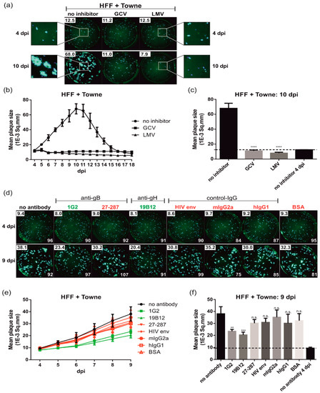 The capacity of antibodies to limit HCMV transmission in fibroblasts remains controversial. Discrepant results in the literature prompted us to establish a live cell PRA to investigate the impact of antibodies on HCMV spread within cell monolayers over time. Viral plaque formation was followed during the course of infection using a fluorescence spot reader (FluoroSpot reader) and GFP as a reporter. In this assay, HFF cells seeded in 96-well plates were infected with 100 PFU/well of GFP-expressing HCMV strain Towne and plaque formation quantified (Figure 1). In order to limit infection of adjacent cells via the extracellular release of the virus, the viral inoculum was replaced 24 hpi with an agarose overlay medium. Starting at 4 dpi, viral plaque size was monitored daily up to 18 dpi. The spot size of all individual fluorescent spots was measured automatically to calculate the mean plaque size per well as described in more detail in the Materials and Methods section. Initially, we determined the consistency of results provided by the assay by determining the effect of HCMV small molecule inhibitors on viral plaque progression (Figure 1a–c). At 24 hpi, together with the agarose overlay medium the DNA replication inhibitor ganciclovir (GCV) or the terminase inhibitor letermovir (LMV) were added to inhibit subsequent rounds of infection. In Figure 1a, sample images are shown from 4 and 10 dpi. As demonstrated by the inserts of Figure 1a, in the absence of inhibitor, viral plaques expanded in size as infection progressed (Figure 1a, compare 4 dpi and 10 dpi insert). As indicated in the upper left corner of the images in Figure 1a, the mean plaque size of the no inhibitor control increased from 12.5 1E-3 Sq.mm at 4 dpi to 68.0 1E-3 Sq.mm at 10 dpi. As expected, treatment with the HCMV replication inhibitors significantly limited the area of the plaque (Figure 1a). As shown in the time-course analysis, the mean plaque area remained constant over the duration of the experiment in the presence of GCV or LMV (Figure 1b). Furthermore, the time-course analysis revealed that the mean plaque size of the no inhibitor control increased steadily until 10 dpi where it reached its maximum after which it declined (Figure 1b). This decrease in plaque size was a consequence of the lysis of initially infected cells and loss of the corresponding GFP signals within plaques, which prevented the software from correctly quantifying individual plaques after several rounds of infection. This result clearly indicated the importance of defining the correct time point following infection when evaluating the potential effect of antibodies on HCMV spread, especially in regard to varying growth kinetics of different virus strains as well as cell types used for infection. Consequently, for all subsequent experiments, we chose the time point of maximum mean plaque size of the mock control to address the impact of inhibitors or antibodies on cell-associated HCMV spread (Figure 1c,f). Another critical experimental parameter that was established was the definition of the mean fluorescent spot size that developed even in cases in which the virus does not spread such as after treatment with GCV or LMV. This measurement represented the initial fluorescence signal that followed the first round of infection, and which was detectable regardless of treatments. Importantly, in accordance with the 96-h replication cycle of HCMV, on day 4 post infection the mean plaque size was still identical in all samples and matched the inhibitor treated samples throughout the duration of the experiment (Figure 1a–c). Thus, for all subsequent experiments the mean plaque size of the mock control at 4 dpi was used to define the baseline fluorescence signal that followed the first round of infection. This was indicated with a dashed line (Figure 1c,f). Next, the PRA was tested by using selected anti-HCMV antibodies directed against glycoproteins B (anti-gB; 1G2 and 27-287) and H (anti-gH; 19B12) along with a panel of negative control mAbs (control-IgG) including the gp120-specific antibody b12 (HIV env) or the murine and human isotype controls mIgG2a and hIgG1, respectively (Table 1; Figure 1d–f). HFFs were infected with Towne-GFP and the respective IgGs as well as a bovine serum albumin (BSA) control were added 24 hpi together with the agarose overlay medium. Viral plaque size expansion was recorded daily up to 21 dpi. Representative images of 4 dpi and 9 dpi are shown in Figure 1d. In addition, the assay was controlled by measuring the total number of fluorescent spots per well (Figure 1d). These measurements allowed us to confirm infection with identical plaque-forming units (Figure 1d, similar spot counts at 4 dpi), and controlled for the formation of new plaques or coalescence of adjacent plaques at later time points of infection which would otherwise lead to incorrect calculation of larger mean plaque sizes (Figure 1d, similar spot counts at 4 dpi compared to 9 dpi). As shown, the mean plaque size of all samples was similar at 4 dpi, while clear differences were detectable after subsequent rounds of replication (Figure 1d–f). In the presence of the anti-HCMV mAbs 1G2 (gB) and 19B12 (gH) plaque size progression was delayed, resulting in statistically significant reduced mean plaque sizes compared to the no antibody control at 9 dpi (Figure 1d–f). Importantly, this effect correlated with the neutralizing activity of 1G2 and 19B12, as neither the non-neutralizing anti-gB mAb 27-287 nor any of the negative controls significantly affected plaque formation (Figure 1d–f). Of note, similar results were obtained when this assay was performed in parallel without agarose overlay medium (data not shown). It can be assumed, that addition of 50 µg/mL of antibody (which corresponds to an approximately 250-fold excess to the IC50 of the mAbs) neutralized the cell-free virus completely. Nonetheless, an agarose overlay medium was used throughout our s