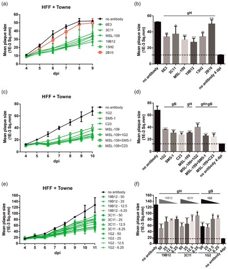 Next, we tested whether more effective reduction could be achieved by antibody combinations (Figure 2c,d). In this experiment, the anti-gH mAb MSL-109 was combined with anti-gB mAbs targeting different antigenic domains (AD) of gB (1G2: AD-5, SM5-1: AD-4, and C23: AD-2) (Figure 2c,d). None of the tested antibody combinations resulted in a significantly improved inhibition of plaque formation. Finally, serial dilutions (50–6.25 µg/mL) of selected anti-gH (19B12 and 3C11) and anti-gB (1G2) mAbs with cell spread inhibitory capacity were assayed (Figure 2e,f). This experiment demonstrated a concentration-dependent inhibitory effect of the antibodies (Figure 2e,f). Even antibody concentrations as low as 6.25 µg/mL could significantly limit cell-associated transmission of HCMV and reduced the mean plaque size up to 30–40% (Figure 2e,f). Nonetheless, 50 µg/mL of mAbs was used in the assay to exclude the spread of HCMV by the extracellular route through neutralization of free virus via an excess of antibody in the cell culture overlay medium [72]. Taken together, the data presented in Figure 1 and Figure 2 indicate that neutralizing anti-gB and anti-gH mAbs have the capacity to significantly inhibit cell-associated HCMV spread in fibroblasts.