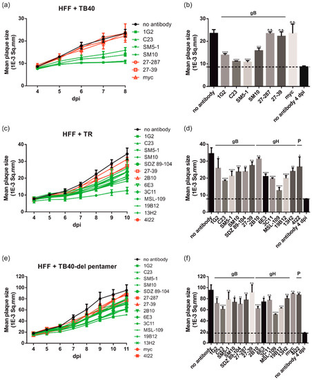 Previous reports noted differences between HCMV strains with respect to inhibition of viral spread by antibodies [46]. To evaluate the effect of strain differences on the cell spread inhibitory activities of anti-gB and anti-gH mAbs in fibroblasts, the PRA was used together with viruses derived from TB40/E and the low-passage clinical HCMV strain TR (Figure 3). For some of the experiments, an extended set of antibodies including additional anti-gB mAbs (SM10, SDZ 89-104, and 27-39), the pentamer-specific mAb 4I22, and an anti-myc antibody as an additional negative control were used in the PRA (Table 1). As demonstrated by the time course analyses of TB40/E (TB40; Figure 3a) and TR (Figure 3c), plaque growth was reduced for both viral strains in the presence of mAbs with neutralizing activity as compared to non-neutralizing antibodies with a statistically significant reduction in mean plaque sizes at 8 dpi (TB40; Figure 3b) and 10 dpi (TR; Figure 3d), respectively. While neutralizing mAbs decreased the mean plaque size between 32–86%, most of the non-neutralizing mAbs exhibited considerably less plaque size reduction (0–36%). As an additional control to ensure that the monitoring of plaque reduction reflected cell-associated spread inhibition rather than a block of infection of adjacent cells via extracellular virus, the experiment was repeated with a pentamer complex-deleted variant of HCMV strain TB40/E (TB40-del pentamer; Figure 3e,f). Expression of the pentameric complex has been shown to promote cell-associated spread [30]. Consequently, TB40-del pentamer should be more prone to antibody-mediated inhibition of plaque expansion if inhibition of cell-associated spread resulted from the inactivation of cell-free virus. However, the decrease in plaque size of TB40-del pentamer virus-infected cells following treatment with neutralizing antibodies (e.g., 1G2, SM5-1, and SM10) was generally less when compared to wild type TB40/E (Figure 3a,b vs. Figure 3e,f). In some cases, neutralizing mAbs (SM5-1, 3C11, and 13H2) failed to significantly reduce the mean plaque size in TB40/E-del pentamer virus-infected cells (Figure 3f). In the presence of the pentamer complex (TB40/E; Figure 3a,b) neutralizing mAbs induced a plaque reduction of 52–86% compared to between 19–57% in the case of TB40-del pentamer (Figure 3e,f). These observations further strengthen the argument that neutralization of cell-free virus was not the mechanism of neutralizing antibodies in these assays of cell-associated virus spread in fibroblasts. As pentamer-specific mAbs are known to fail to neutralize HCMV infection in fibroblasts [37,38], 4I22 had no significant effect on cell-associated virus spread in this assay (Figure 3c–f). Of note, deletion of the pentamer increased plaque size without antibody about two-fold (Figure 3a,e, compare plaque sizes at 8 dpi), so the cell-associated spread is clearly enhanced by this mutation and the mutation somehow contributes to sensitivity to neutralizing antibodies. Overall, these data led to the conclusion that HCMV spread inhibition by gB- and gH-specific antibodies with virus-neutralizing activities was virus strain-independent in fibroblasts.