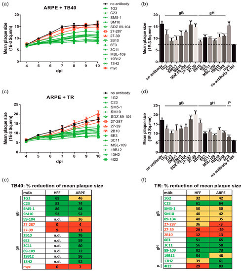 After having established the assay, a broad panel of well-characterized neutralizing anti-gH (6E3, 3C11, MSL-109, 19B12, 13H2, and 2B10) and anti-gB mAbs (1G2, SM5-1, and C23) listed in Table 1 were assayed to address their impact on HCMV transmission in fibroblasts. As illustrated, all neutralizing antibodies tested limited HCMV spread significantly resulting in a 50–79% reduction of the mean plaque size at 9 and 10 dpi, respectively (Figure 2a–d). A notable exception was mAb 2B10 (9% reduction) which represents a potent strain-specific neutralizing antibody directed against gH of a subset of HCMV strains including TB40/E (Figure 3e) but not Towne (Figure 2a) or TR (Figure 3c) (Table 1) [69].