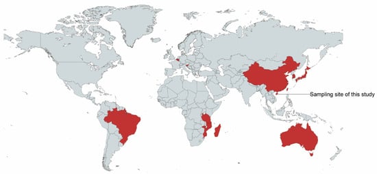 - Kumar, S.; Stecher, G.; Tamura, K. MEGA7: Molecular Evolutionary Genetics Analysis Version 7.0 for Bigger Datasets. Mol. Biol. Evol. 2016, 33, 1870–1874. [Google Scholar] [CrossRef] [PubMed] [Green Version]