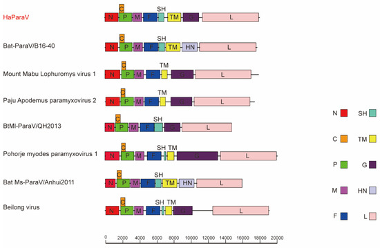 Most orthoparamyxoviruses are known to cause diseases in their respective hosts with several of them known as zoonotic pathogens [1]. Emerging outbreaks of several zoonotic paramyxoviruses, such as measles virus, Nipah virus, mumps virus, and Hendra virus, have caused severe diseases and high fatality rates in humans [2]. Additionally, it is important to notice that the Paramyxoviridae is a family of negative-sense, non-segmented, large-enveloped RNA viruses consisting of 17 genera within four subfamilies [3,4,5]. The paramyxoviruses genomes range from 14,296 to 20,148 nucleotides (nt) in length, which encode a gene arrangement (3′-to-5′) of 6–10 proteins, including six structural proteins: nucleocapsid (N), phosphoprotein (P), matrix protein (M), fusion protein (F), glycoprotein (G), RNA polymerase (L), and three accessory proteins, such as: C protein (C), small hydrophobic protein (SH), and transmembrane protein in some members [3,6,7]. The genus Jeilongvirus, belonging to the subfamily Orthoparamyxovirinae within family Paramyxoviridae, is a newly established genus in 2020, and it currently includes seven species with accessory SH and/or TM proteins between F and G proteins [3,8].