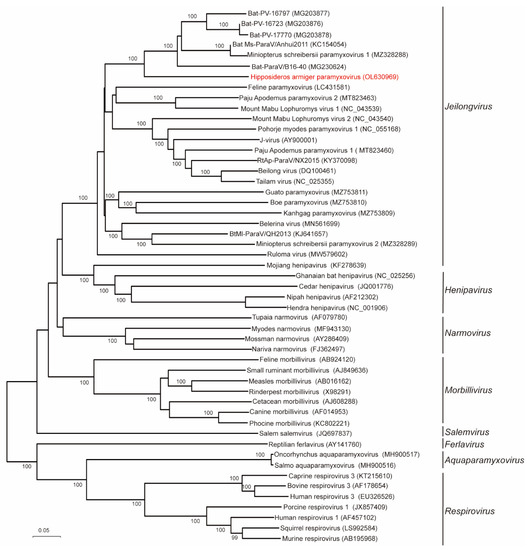 Phylogenetic analysis based on L proteins of subfamily Orthoparamyxovirinae. The evolutionary tree was inferred using amino acid sequences by the Maximum Likelihood algorithm with 1000 bootstraps. Only bootstrap values above 90% are shown. The accession numbers of each virus are labeled in brackets after corresponding viral names. The virus identified in this study is labeled with red font.