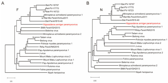 The phylogenetic analyses were conducted based on the deduced amino acid sequences of L, F and N (Figure 3 and Figure 4) proteins, respectively. The resulting phylogenetic tree established based on L proteins of all members within subfamily Orthoparamyxovirinae revealed that HaParaV formed an independent clade within genus Jeilongvirus, and was closely related to Bat-ParaV/B16-40 (Figure 2). Additionally, the phylogenetic trees established based on F and N proteins showed similar results, indicating that HaParaV was a unique lineage and clustered with Bat-ParaV/B16-40 (Figure 3) within genus Jeilongvirus.