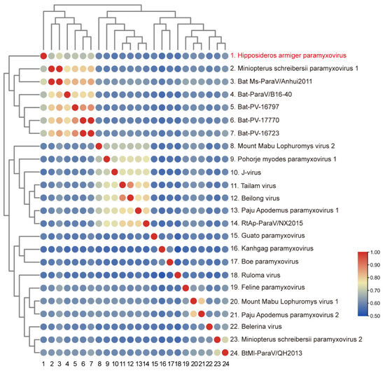 The genetic distances between the virus identified in this study and members of genus Jeilongvirus. The p-distance values are estimated using amino acid sequences of complete L proteins. The numbers (1–24) below the picture represent the corresponding viral names on the right side of the picture. The p-distance values were showed as colored circles. The rows and columns were clustered based on paired values. The scale values range from 0.5 to 1. The virus identified in this study is labeled with red font.