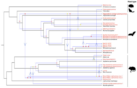Host-virus co-phylogenetic analysis of Jeilongvirus. The virus identified in this study is labeled with red font. The host tree was inferred using TreeTime. The phylogenetic tree of viruses was built based on L proteins. Co-speciation, host-switching, duplication, and loss events are labeled with filled circles, arrows, empty circles, and dotted lines at the nodes, respectively. The colors of circles represent different placements: red for all other placements worse, and yellow for equally good placement exists. The names of the viruses are labeled with red font, and virus from this study is labeled with bold type. The small picture represents the corresponding host type.