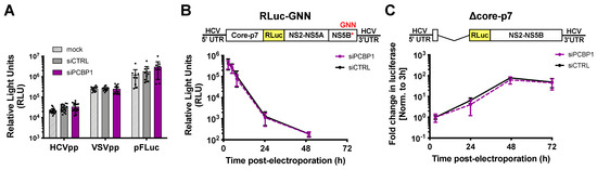 To clarify PCBP1’s precise role(s) in the HCV life cycle, we used assays to specifically examine different steps of the viral life cycle (Figure 2). Firstly, we explored whether PCBP1 knockdown had an effect on viral entry using the HCV pseudoparticle (HCVpp) system. HCVpp are lentiviral vectors with a firefly luciferase reporter gene pseudotyped with the HCV E1 and E2 glycoproteins [22]. HCVpp engage with HCV-specific entry receptors, then enter cells by clathrin-mediated endocytosis; thus, to account for any changes in clathrin-mediated endocytosis, we used vesicular stomatitis virus (VSV) pseudoparticles (VSVpp) as a control. In addition, to verify that PCBP1 knockdown did not affect luciferase reporter gene expression, we assessed firefly luciferase expression from cells directly transfected with a FLuc reporter plasmid. In all cases, we found that depletion of endogenous PCBP1 had no impact on luciferase activity (Figure 2A). This suggests that PCBP1 knockdown does not affect FLuc reporter expression, clathrin-mediated endocytosis, or HCVpp entry.