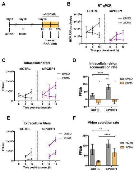 PCBP1 knockdown enhances infectious virion secretion even in the absence of RNA replication. (A) Schematic representation of the experimental approach for 2′CMA experiments: two days post-siRNA transfection, Huh-7.5 cells were infected with JFH-1T (MOI = 0.05). Three days post-infection, the cell culture medium was replaced with media containing 2′CMA or DMSO (vehicle control). Total RNA, intracellular and extracellular virus were collected at t = 0, 6 and 12 h post-treatment. (B) Quantitative RT-PCR analysis after 2′CMA treatment. (C) Intracellular viral titers and (D) intracellular virus accumulation rate calculated by linear regression (see also Figure S4). (E) Extracellular viral titers and (F) virus secretion rates calculated by linear regression. All data are representative of three independent replicates and error bars in (B,C,E) represent the standard deviation of the mean. Error bars in (D,F) represent the slopes of the linear regressions ± standard error. Statistical significance was calculated by two-way ANOVA. (ns, not significant; ** p < 0.01; **** p < 0.0001).