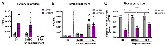 Three days post-infection with JFH-1T, the cell culture media was replaced with complete Huh-7.5 media with 5 µg/mL BFA (Brefeldin A, Biolegend, San Diego, CA, USA) or equal volumes of DMSO (vehicle control) [24]. Total RNA, intracellular virus, and extracellular virus samples were collected at 0 and 6 h post-treatment. Protein samples were collected from untreated cells to verify PCBP1 knockdown by Western blot.