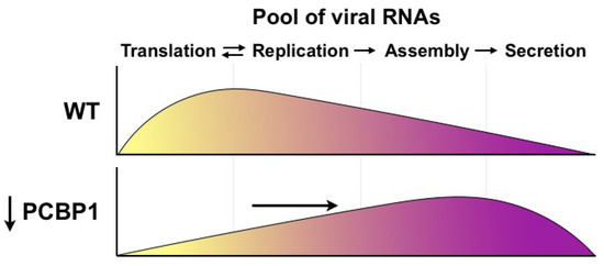 Herein, we investigated the role of PCBP1 in the HCV life cycle. Previous studies had found that PCBP1 interacts with the HCV 5′ UTR in vitro [10,15], and that PCBP1 silencing inhibited HCV RNA accumulation in cell culture [16], yet the precise steps of the HCV life cycle modulated by PCBP1 remained unclear. Our systematic evaluation of the effects of PCBP1 knockdown on individual steps of the viral life cycle revealed that PCBP1 depletion did not directly affect virus entry, translation, genome stability or viral RNA replication, but rather resulted in increased infectious virion production in cell culture. Specifically, PCBP1 knockdown significantly increased virion secretion, resulting in the depletion of intracellular viral RNA. Additionally, inhibiting virion secretion could partially restore HCV RNA accumulation during PCBP1 knockdown. Thus, our findings suggest a model whereby endogenous PCBP1 normally limits virion assembly and secretion, such that viral genomes remain available to engage in the translation and replication steps of the viral life cycle (Figure 5). As such, PCBP1 depletion increases the proportion of viral genomes engaged in virion assembly and secretion, which decreases the pool of translating/replicating viral RNAs. We anticipate that these differences in intracellular viral RNA levels would compound over time, with PCBP1-replete cells rapidly increasing their pool of intracellular viral RNA through repeated cycles of translation and RNA replication, while the smaller pool of translating/replicating RNAs in PCBP1-depleted cells would result in a much slower rate of viral RNA accumulation over time.