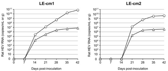 To examine the infectivity of the rat HEV recovered from the infected cynomolgus monkey, we prepared a 10% stool suspension from the fecal samples collected on day 19 p.i., and we inoculated 0.5 mL of the sample containing 5.2 × 104 copies/mL of the virus into two nude rats, LE-cm1 and LE-cm2, through the tail vein. The viral RNAs, 2.42 × 105 copies/g and 1.51 × 104 copies/mL, were first detected in the feces and serum collected from nude rat LE-cm1 on day 14 p.i. Similarly, 1.38 × 107 copies/g and 1.73 × 105 copies/mL of the virus RNAs were detected in the feces and serum collected from nude rat LE-cm2 on day 21 p.i. The virus RNA in the feces increased to 7.34 × 1010 copies/g in LE-cm1 and 4.13 × 109 copies/g in LE-cm2 on day 42 p.i. On the same day, 7.11 × 106 copies/mL and 4.01 × 106 copies/mL of the viral RNAs were detected in the serum samples collected from LE-cm1 and LE-cm2, respectively (Figure 2).