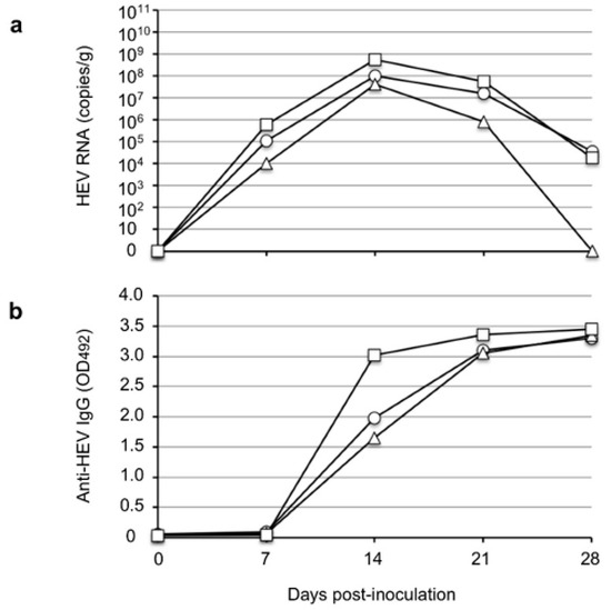 The results of the present study demonstrated that V-105 strain rat HEV was capable of experimentally infecting and replicating in cynomolgus and rhesus monkeys. These results indicate the possibility of rat HEV zoonotic infection, and they suggest that cynomolgus and rhesus monkeys might be usable as animal models for infection experiments. We observed no elevation of ALT in the infected monkeys during the period of infection, which suggests that no serious liver damage was induced in the monkeys by rat HEV infection; however, histopathological analyses will be needed to fully clarify the pathogenicity. In addition, the viral RNA in the monkey sera was under the detection limit and the titers were <106 copies/g in the fecal specimens; these values are significantly lower than those in Wister rats, that is, 107 copies/g to 108 copies/g (Figure 4a), and those in nude rats, that is, 109 copies/g to 1010 copies/g (Figure 2), when these species were inoculated with the same virus strain. These findings suggest that the rat HEV replication in monkeys may be limited, and they led us to examine whether the ability of the virus to replicate in humans is also limited.