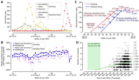 The Delta VOC became the dominant variant in Gauteng and KwaZulu-Natal in June 2021, causing an epidemic wave that peaked at the beginning of July 2021 in Gauteng and the end of August 2021 in KwaZulu-Natal, Figure 1A. The number of Omicron (or other variant) cases were estimated by multiplying the weekly number of total COVID-19 confirmed cases by the proportion of Omicron (or other variant) genomes among all collected genomes in a given week (see Supplementary Table S1). Between July and October 2021 in Gauteng and in September and October in KwaZulu-Natal, the weekly number of COVID-19 cases was decreasing despite no significant reduction in population mobility at workplaces and retail and recreation centers (Figure 1B). The emergence of the Omicron variant has caused recent rapid epidemic outbreaks in both provinces considered (Figure 1A). In Figure 1C we show the exponential growth of Omicron variant cases in weeks 45–48 in 2021 (8 November–5 December) in Gauteng and in weeks 46–49 in Kwazulu-Natal. This method, in contrast to analyzing only the proportion of new strain genomes [18], enabled us to follow Omicron growth after its fixation in weeks 47–48 in 2021. The Omicron doubling time, estimated based on the log–linear regression of the number of weekly cases in the four-week periods, is equal to 3.3 days (95% CI: 3.2–3.4 days) in Gauteng, and 2.7 days (95% CI: 2.7–3.3 days) in KwaZulu-Natal.