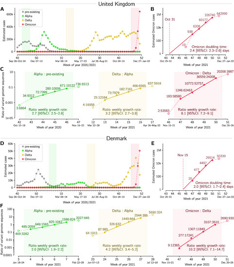 Succession of SARS-CoV-2 strains in the UK and in Denmark. (A,D) Estimated number of weekly cases infected with a particular strain over the weeks of 2020 and 2021. (B,E) Estimated number of weekly Omicron cases and the doubling time estimate based on log–linear regression in four whole-week periods (filled circles). (C,F) Ratios of weekly cases of an emergent strain to the previously dominant strain, and the estimate of ratios’ growth rates based on log–linear regression in four whole-week periods (subpanels correspond to shaded regions in respective panels (A,D)). A dataset for this figure is provided as Supplementary Table S5.