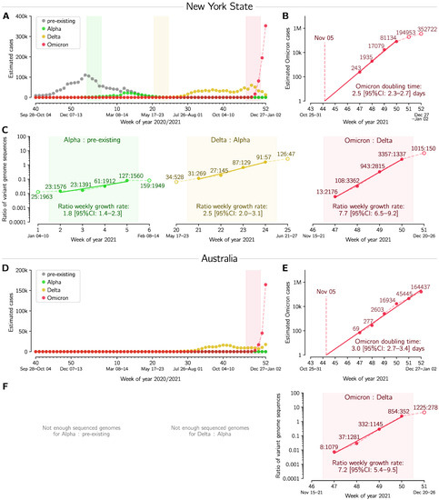 In Figure 3 we analogously analyze Omicron-driven outbreaks in New York State and Australia, and again compare them with outbreaks caused by two previous VOCs, Alpha and Delta. In New York State, the Alpha variant arrived during the end phase of the second wave, and consequently caused a noticeable but relatively modest rise in cases. It was then outcompeted by Delta, which, causing the third epidemic wave, quickly reached fixation. In Australia, due to stringent lockdowns and strict border rules, there were relatively few COVID-19 cases before the Delta variant. In both regions, Omicron became the dominant variant within one month after its first detection (Figure 2A,D). We estimate the doubling time of Omicron to be 2.5 and 3.0 days in New York State and Australia, respectively (Figure 2B,E). In the 4-week period considered, the Omicron/Delta ratio was found to grow exponentially with a weekly rate 7.7 in New York State and 7.2 in Australia. This is significantly higher than the Delta/Alpha and Alpha/pre-existing strains growth rates in the New York State, estimated to be 2.5 and 1.8, respectively. All data used in Figure 3 are provided in Supplementary Table S5.