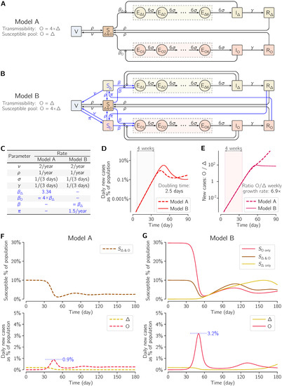 Model dynamics are governed by a system of ordinary differential equations (18 ODEs in Model A, 20 ODEs in Model B). The ODEs may be unambiguously derived, assuming mass-action kinetics, based on model schemes in Figure 4A,B, and parametrized with kinetic rates given in Figure 4C. On the first day shown in Figure 4D–G, when the system is in equilibrium with Delta, just one individual (in a population of 106 individuals) is exposed to Omicron. As emphasized further in Results, the initial exponential phase of the Omicron outbreak is nearly identical within both models.