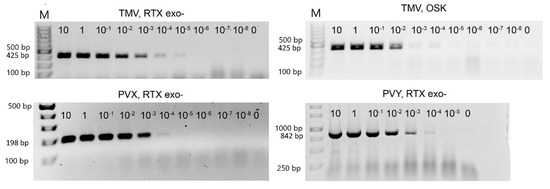 We used three purified viruses (PVX, PVY, and TMV) to determine the detection limits of both RTX and the commercial one-step RT-PCR kit. The reactions with the RTX enzyme provided sufficient sensitivity to reliably detect 1 pg of PVX and PVY or 0.01 pg of TMV per reaction (Figure 2). The detection limit for TMV was in the range of about six virus particles per 1 µL of reaction mixture, 70 virus particles per 1 µL for PVX, and approximately 400 virus particles per 1 µL for PVY. For TMV, the detection limits of RTX and the commercial one-step RT-PCR kit (Qiagen, Hilden, Germany) were compared. In this comparison, the sensitivity of the RTX reaction was slightly higher than the sensitivity of the one-step kit (approximately 1 pg per reaction vs. 0.01 pg in the RTX-based assay, see Figure 2). The sensitivity of the RTX-based assay is at least an order of magnitude higher than the sensitivities reported in the literature for similar protocols, such as standard RT-PCR [40] (1 pg for PVY), non-isotopic molecular hybridization [41] (5 pg), or one-step RT-PCR [42] (5 pg). Although we did not achieve such high sensitivity in the detection of PVX and PVY, these are still very low thresholds that are consistent with the values reported in the literature and are useful for most practical purposes. We hypothesise that the higher sensitivity of TMV detection compared to PVX or PVY may be the result of a complex relationship between the primers and template sequences and the viral particle shape and stability. The rod-shaped TMV particles are also less prone to aggregate formation; such aggregates might interfere with the generation of accurate dilution series.