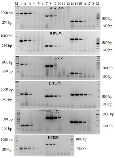 RTX-PCR pro detection of viruses (showing representatives of the detected viruses). (A) WSMV (total RNA of wheat leaves): Lane M—GeneRuler 1kb and 100 bp Plus DNA Ladder (Thermofisher Scientific, USA); lanes 1–6—primer pair WSMVcoatPRv/WSMVcoatPFv, 1014 bp; lanes 7–12—primer pair WSM8166/WSM8909, 743 bp; lanes 13–18—primer pair WSMVspeFv/WSMVspeRv, 354 bp. (B) BYDV (total RNA of barley leaves): lanes 1–6—primer pair BYcpF/BYcpR, 640 bp; lanes 7–12—primer pair BYDV-PVinterF/BYDV-Yan-Ra, 294 bp; lanes 13–18—primer pair BY5661R/BY4836F, 825 bp. (C) TuMV (total RNA of Chinese cabbage leaves): lanes 1–6—primer pair TuMV-full-CPF/TuMV-full-CPR, 896 bp; lanes 7–12—primer pair Nibfrg1F/Nibfrg1R, 737 bp; lanes 13–18—primer pair TuMV-F1qPCR/TuMV-F2qPCR, 208 bp. (D) TuYV (total RNA of oilseed rape leaves): lanes 1–6—primer pair TuYV-full-CPF/TuYVR-K2, 966 bp; lanes 7–12—primer pair luteoviruses-F/luteoviruses-R, 610 bp; lanes 13–18—primer pair TuYV-full-CPF/TuYV-full-CPR, 947 bp. (E) PDV (total RNA of plum leaves): lanes 1–6—primer pair PDVdpuF/PDVdpR, 220 bp; lanes 7–12—primer pair PDVcpF/PDVcpR, 687 bp; lanes 13–18—primer pair PDVrna2F/PDVrna2R, 418 bp. (F) TRSV (total RNA of tomato leaves): lanes 1–6—primer pair MF05-21-R/MF05-22-F, 320 bp; lanes 7–12—primer pair TRSV-Pr-F/TRSV-R, 523 bp. The serial dilutions of total RNA were 1:1 in lanes 1, 7, and 13 in (A–E) and lanes 1 and 7 in (F); 1:10 in lanes 2, 8, and 14 in (A–E) and lanes 2 and 8 in (F); 1:100 in lanes 3, 9, and 15 in (A–E) and lanes 3 and 9 in (F); 1:1000 in lanes 4, 10, and 16 in (A–E) and lanes 4 and 10 in (F); 1:10000 in lanes 5, 11, and 17 in (A–E) and lanes 5 and 11 in (F); 1:100000 in lanes 6, 12, and 18 in (A–E) and lanes 6 and 12 in (F).