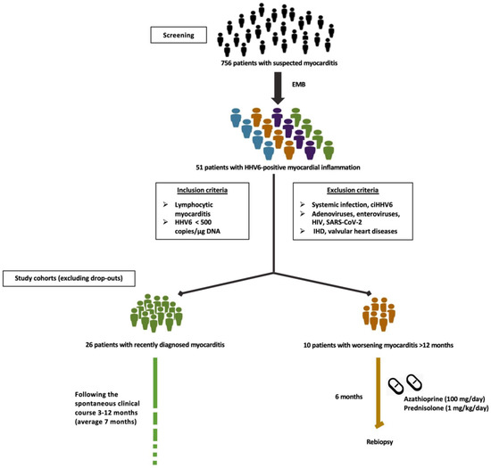 Patients with persistent symptoms of unexplained heart failure (HF), who do not improve despite conservative therapy, are indicated for EMB-guided diagnosis [15]. All subjects gave their informed consent for inclusion before they participated in the study. The study was conducted in accordance with the Declaration of Helsinki, and the protocol was approved by the Ethics Committee of Berlin (ethics application number EA2/140/16). At our cardiomyopathy center, 756 consecutive patients with symptoms suggestive of myocardial disease underwent catheter-guided LV-EMB procedures in the period from January 2015 until December 2020 [17,18]. EMB samples as well as blood samples were analyzed at the Cardiopathology unit of the Institute for Pathology and Neuropathology Tübingen University Hospital. The viral genome copy number was evaluated in EMB as well as in peripheral blood mononuclear cells (PBMCs), whenever possible, by a nested and quantitative real-time polymerase chain reaction (RT-PCR) as described elsewhere [19,20]. When HHV6 DNA was detected only in the nested PCR but not in the first RT-PCR, low copy numbers are reported. Only patients whose EMB revealed HHV6 DNA-associated lymphocytic myocarditis as detected by histology/immunohistology, with a copy number <500 copies/µg DNA, were selected for further investigation. Patients with systemic infection, HHV6 integrated in the genome (ciHHV6), myocardial presence of RNA/DNA of enteroviruses, adenoviruses, or patients with known human immunodeficiency virus infection or with severe acute respiratory syndrome coronavirus 2 (SARS-CoV-2) infection or other cardiac diseases (e.g., ischemic heart disease, valvular disease) were excluded. In total, 38 patients matched the inclusion and none of the exclusion criteria. Twenty-eight patients presented with recent-onset myocarditis, of which 2 dropped out after initial examination. The other 10 patients had ongoing or worsening myocarditis (>12 months). The study design is fully illustrated in Figure 1.