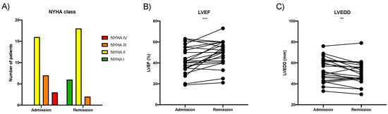 Patients with HHV6 DNA-associated myocarditis may improve spontaneously. (A) Columns represent the New York Heart Association (NYHA) functional class distribution of the patients at admission and after spontaneous remission. Connected dots represent the individual changes in (B) left ventricular ejection fraction (LVEF), (C) LV-end-diastolic diameter (LVEDD) between admission and spontaneous remission, N = 26. Statistically tested via paired t-test, ** p ≤ 0.01, *** p ≤ 0.001.