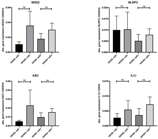 HHV6 DNA presence in the myocardium has no significant effect on the mRNA expression of NOD-like receptor pyrin domain-containing-3 inflammasome components both in presence and absence of myocardial inflammation. Bars represent the absolute gene expression values as mean ± SEM. Cyclin Dependent Kinase Inhibitor 1B (CDKN1b) was used as endogenous control. NOD2, nucleotide-binding oligomerization domain-containing protein 2; ASC, adaptor protein ASC; IL1β, interleukin 1-beta. N = 4–6 patients/group. ns p ≥ 0.05.