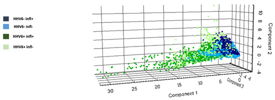 Discriminatory peptide signatures within groups of patients with clinical symptoms of myocarditis. 2D scores plot of MALDI IMS-derived spectra for components 1, 2, and 3 shows possibility of distinguishing endomyocardial biopsy peptide signature of patients with human herpesvirus 6 (HHV6) and myocarditis (dark-green cluster), myocarditis without HHV6 (dark blue), HHV6 without myocarditis (light-green cluster), and myocarditis-negative without HHV6 (pale-blue cluster).