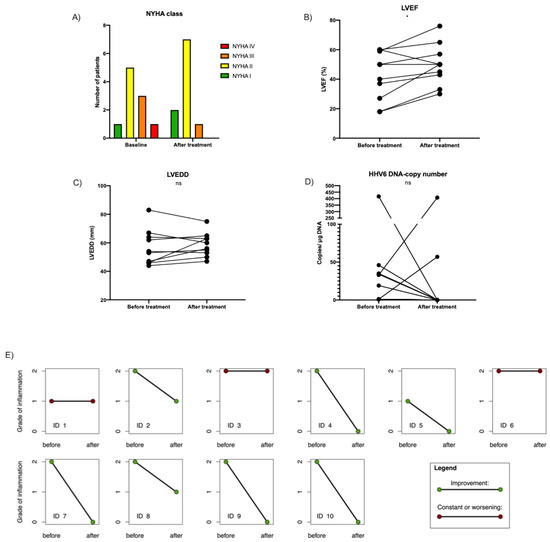 Patients with HHV6 DNA-associated myocarditis treated with steroid-based immunosuppression. (A) Columns represent the New York Heart Association (NYHA) functional class distribution of the patients before and after treatment. Connected dots represent the individual changes in (B) left ventricular ejection fraction (LVEF), (C) LV-end-diastolic diameter (LVEDD), (D) HHV6 DNA copy numbers, and (E) grade of inflammation (defined as grade I: ≥14 leucocytes/mm2, ≥7 cells/mm2 CD3-positive T-lymphocytes and grade II ≥28 leucocytes/mm2, ≥14 cells/mm2 CD3-positive T-lymphocytes) following six months of combined immunosuppression treatment. N = 10. Statistically tested via paired t-test, * p < 0.05, ns: p ≥ 0.05.