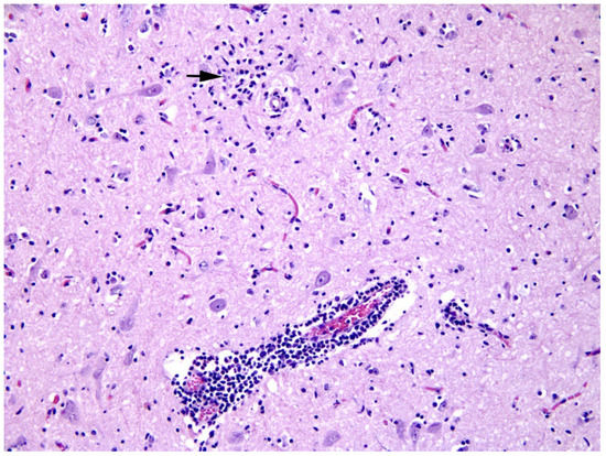 Histologic section of the midbrain (grey matter) stained with H&E. A perivascular space (lower center) is infiltrated by lymphocytes and histiocytes; the surrounding neuroparenchyma is hypercellular due to increased numbers of glial cells, including microglia, that occasionally form nodules (arrow) or arrange near the body of neurons (satellitosis).