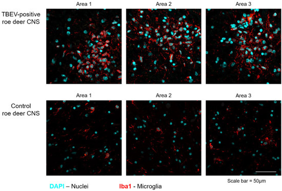 Representative staining of Iba1+ cells (microglia, red) in TBEV-positive and control roe deer midbrain. Nuclei are stained with DAPI, light blue. Scale bar: 50 μm.