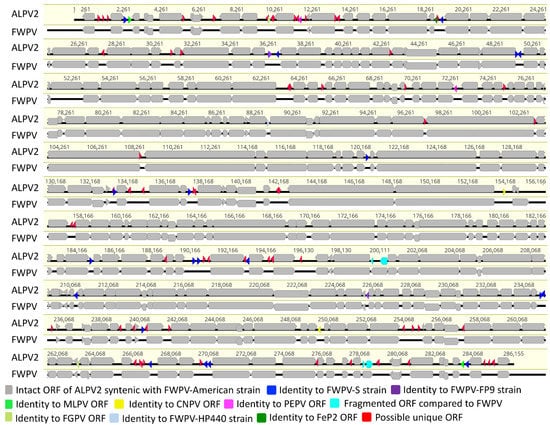 Comparative analysis of representative avipoxviruses and ALPV2 based on complete genome nucleotide sequences.