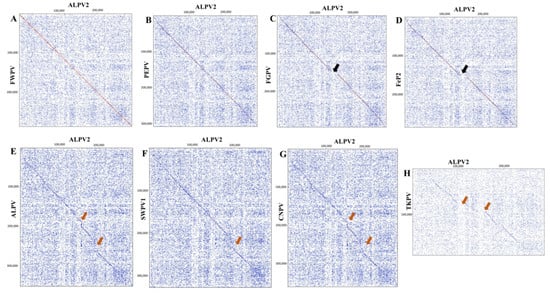 Comparison of the ALPV2 genome with those of other avipoxviruses was performed using dot plot analyses. The ALPV2 genome was highly syntenic with FWPV, PEPV, FGPV and FeP2 (Figure 2A–D). Moreover, differences in synteny with FGPV and FeP2 were observed (Figure 2C–D, highlighted as black arrows), mainly due to the presence of two large additional copies of variola B22R gene family proteins in ALPV2 (ORF-170 and -171, 1870 and 1766 amino acids in length, respectively). The ALPV2 genome also demonstrated significant differences in the entire genome compared to ALPV, SWPV1, CNPV and TKPV (Figure 2E–H). Within these highlighted regions (orange arrows), multiple SNPs and insertions/deletions (indels) accounted for the variation observed between the genomes (Figure 2E–H).