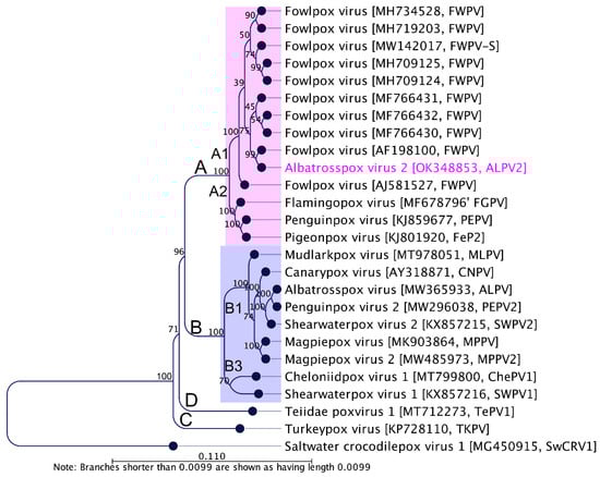 The following supporting information can be downloaded at: https://www.mdpi.com/article/10.3390/v14020302/s1, Figure S1: Maximum likelihood (ML) phylogenetic tree from partial nucleotide sequences of the DNA polymerase gene of selected avipoxviruses; Figure S2: Maximum likelihood (ML) phylogenetic tree from partial nucleotide sequences of the P4b gene of selected avipoxviruses; Table S1: Albatrosspox virus 2 (ALPV2) genome annotations and comparative analysis of ORFs.
