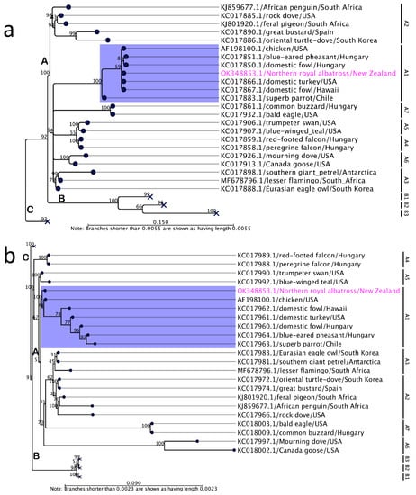 Maximum likelihood (ML) phylogenetic tree from partial nucleotide sequences of the DNA polymerase gene (a) and P4b gene (b) of selected avipoxviruses. Labels at branch tips refer to GenBank accession number/species/country of origin. The numbers on the left show bootstrap values as percentages. The relevant sub-clade A1 is highlighted using blue shading, whilst the position of ALPV2 is highlighted using pink text. The ML tree is displayed as a phylogram. The bootstrap value assigned to a node in the output tree is the percentage (0–100) of the bootstrap resamples which resulted in a tree containing the same subtree as that rooted at the node. Major clades and sub-clades are designated according to Gyuranecz et al. (2013) [59]. Major clades B and C in both the trees (a) and (b) are collapsed. For the complete ML phylograms, please see Supplementary Figures S1 and S2.