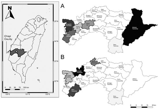 From October 2018 to May 2019, this community-based screening was conducted in Chiayi County, involving 17 out of 18 townships, excluding Dapu Township (Figure 1). The primary health care center of each township performed the screening; all subjects aged 30 years or older who had never undergone hepatitis screening in the database of the Chiayi County Health Bureau were invited for screening. All participants signed a consent form before blood sampling. Two biomarkers were detected: qHBsAg (Architect HBsAg; Finisklin Business Park, Sligo, Ireland) and HCV Ag (Architect HCV core antigen detection assay; Abbott Laboratories, Sligo, Ireland). The detection limit of qHBsAg was 0.05 IU/mL. HBV DNA levels were <2000 IU/mL in all subjects with <8 IU/mL. The best cutoff level of qHBsAg to predict HBV DNA <2000 IU/mL was 200 IU/mL, with sensitivity, specificity, accuracy, and positive and negative predictive values of 75.0%, 76.1%, 75.8%, 70.0%, and 77.9%, respectively [11]. Patients positive for HCV Ag were referred to clinics or hospitals for further evaluation and treatment.