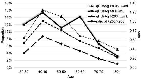 Age−specific prevalence of quantitative HBsAg by cutoffs of 0.05, 8, and 200 IU/mL. The ratio of ≥200/<200 was also shown.