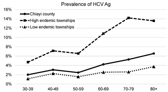 The HCV Ag results are shown in Table 2, Figure 1 and Figure 3. The overall prevalence of HCV Ag was 4.1% (163/4010), without a sex difference (males: 4.2% vs. females: 3.9%, p = 0.665). Township-specific prevalence ranged from 0.3% to 14.6%. Lioujiao (14.6%, 40/274) and Yijhu (11.3%, 29/257) showed the highest prevalence rates. Sikou (7.2%, 11/152) and Dongshih (5.2%, 9/172) were ranked 3rd and 4th and others were <4%. The prevalence increased with age. The prevalence of the four previously mentioned high-prevalence townships were much higher than that those of the other 13 low-prevalence areas in each age group. The mean logarithmic concentration of HCV Ag was 3.32 ± 0.90.