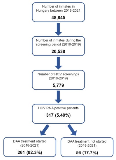 Previous studies reported that DAA treatments in the inmate populations are feasible, safe, and effective [9,10,11]. Here, we report a summary of the results of our HCV screening and treatment program conducted with 5779 Hungarian inmates between 2018 and 2019.